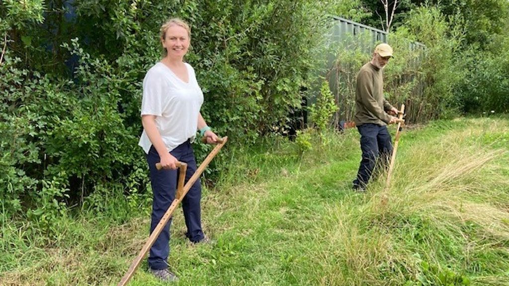 Kate Clark has a go at scything with Fred Millar