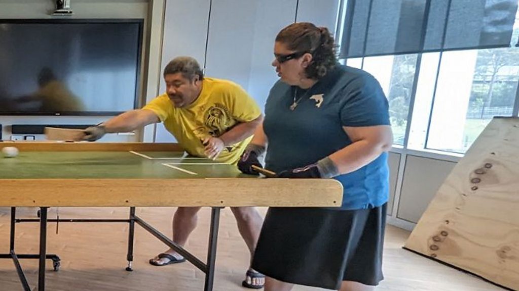 Ever heard of the sport swish? It’s a modified version of table tennis developed by visually impaired athletes in Australia. Often described as a mix between table tennis and air hockey, players hit the cricket-sized ball under a solid screen using a rectangular bat with the aim of getting the ball past their opponent at the other end of the table. It’s known for its inclusivity and the fact players – whether they are blind, vision impaired or have full sight – compete on almost equal terms. Sportshour’s Shabnam Younus-Jewell speaks to Jenni Forbes from Frankston Swish Club in Australia to find out more. Photo: Jenni Forbes plays the Australian sport of Swish. (Credit: Jenni Forbes)