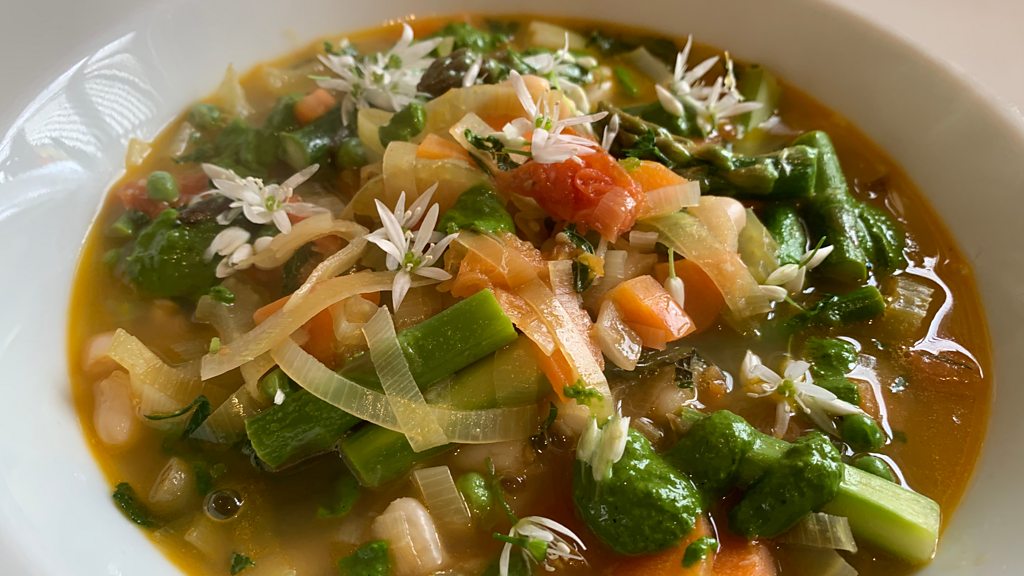 Spring Pistou soup (serves up to 4 smaller bowls) This is based on a French classic of Pistou soup but I have added a spring like twist to it by adding in British asparagus and also wild garlic that are bang in season now. Plus adding other herbs to give it that more fresh spring like taste. A very light dish packed with goodness that’s simple to do and also inexpensive. Ingredients:- - A good glug of British cold pressed rapeseed oil or olive oil - 1 carrot diced into fine chunks - 1 celery stick sliced finely - 1 leek sliced finely - Approximately 10 cherry style tomatoes (I used piccolo ones on the vine) - 3/4 of a 400g tin of cannellini beans drained and rinsed in cold water - 3/4 of a gel pot of chicken stock or vegetable if you wish - Approximately 600ml of water - A bunch of British asparagus, wooded bottom taken off and for an inch peel off also and chop into 3 chunks. - A good handful or 2 of frozen British petit pois peas, defrosted and drained - A small handful of fresh mint and fresh flat leaf parsley chopped finely - For the Pistou:- - A good handful of fresh basil - Two big handfuls of wild garlic leaves - 2 big glugs of the same oil used ie the rapeseed oil and blend all together into a bright green pesto (Pistou) like paste (if you can’t get hold of wild garlic you can use 4 cloves of fresh garlic puréed and could use some basil pesto to bulk it out). Method:- - In a large saucepan bring your oil up to a medium heat and add in the celery, carrot and leek and sweat down for a few minutes. - Add in the tomatoes stiring not to catch anything to burn at all. - Then add in your chicken stock and water and stir. Cook for a couple of minutes - Add in your cannellini beans and cook for a further approximately 7-8 minutes - In the meantime blitz your Pistou together - Then add your Asparagus and cook for 2 minutes and then add your peas - Finish with your chopped mint and parsley and drizzle your Pistou. If you do have wild garlic and have some flowers finish on top also . And voila!