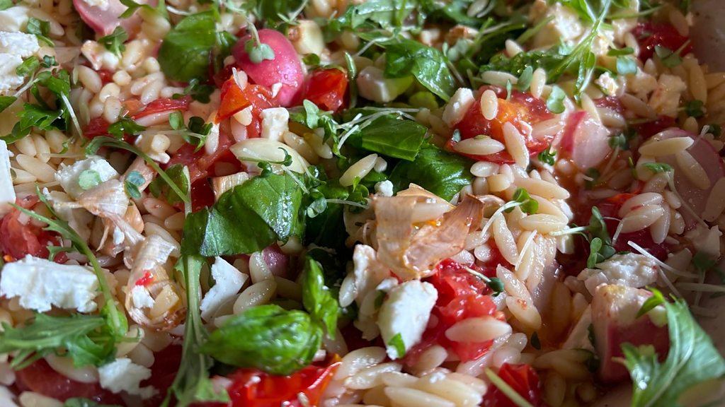 Roasted British Tomatoes with radish, orzo and feta. Recipe serves 4 people. Ingredients: - Roasted fruit/ veg and herbs - A good few glugs of British cold pressed rapeseed oil - Roughly 20 British tomatoes small plum or cherry style. I used piccolo and San Marzano ones, halved through the middle - a handful of round British radishes cut into quarters - 6-8 cloves of garlic depending on size, bashed - 2 sprigs of fresh rosemary - 1 small handful of lemon thyme or normal thyme and just add a little lemon zest - Sea salt and cracked black pepper to season - Roughly 4-5 handfuls of orzo pasta - 1/3 chicken gel stock pot or veg if you require - To finish: - 1/4 of a pack of feta ( approx 50g ) into small chunks and slightly crumbled - A good handful of fresh basil, torn - A good handful of fresh flat leaf parsley, torn - A small handful of mizuna or rocket leaves sprinkled for on top - A small handful of cress to finish. Method: - Place all roasted veg ingredients into one roasting dish and place into a preheated oven of 190 and cook for 20 minutes. - Meanwhile cook your orzo to packet instructions. Drain off and toss through the stock and a drizzle of oil and set aside. - When the roasted ingredients are done, toss through the orzo. Take out the rosemary and thyme if possible. Add your feta, stir and finish with your herbs and leaves.