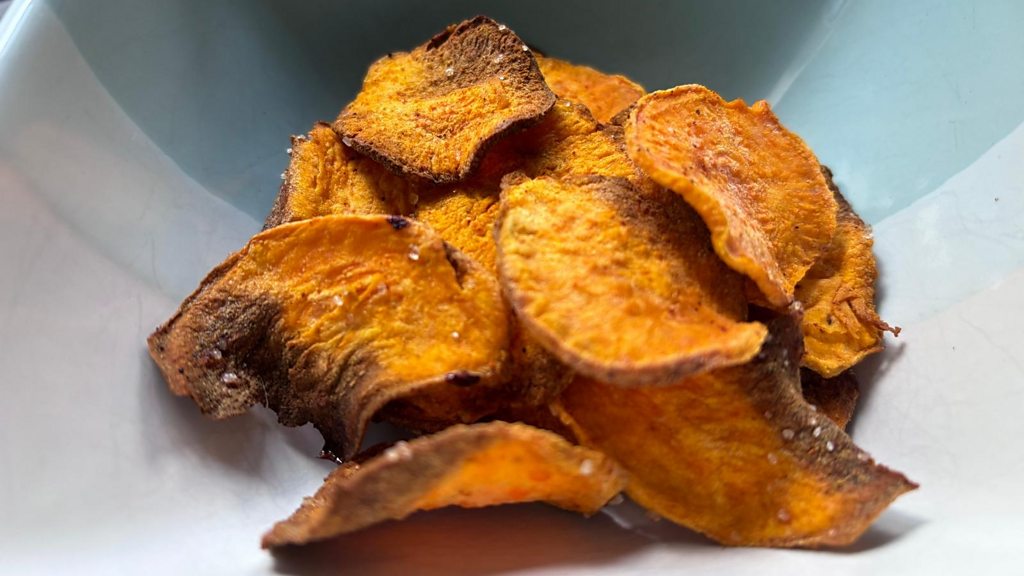 Ingredients: 1 ½ cups sweet potatoes - 2 medium sweet potatoes 1 tablespoon extra virgin olive oil 1 tablespoons brown sugar 1/2 teaspoons chili powder 1 teaspoon ground cumin ½ teaspoon salt Instructions: 1. Thinly slice sweet potatoes. 2. Toss in a bowl with the salt and leave to stand. 3. Squeeze out any excess liquid. 4. Toss in the oil and the brown sugar, chili powder and cumin. 5. Lay sweet potatoes in a single layer in the air fryer touching or overlapping a tiny bit. 6. Air Fry at 190°C for 6 to 9 minutes at depending on how thin your slices are. 10. Shake the basket halfway through or lightly stir to get them off the bottom of the air fryer bottom. 11. When done remove crisps to a cooling rack and let them cool. They will get crispier as they cool.