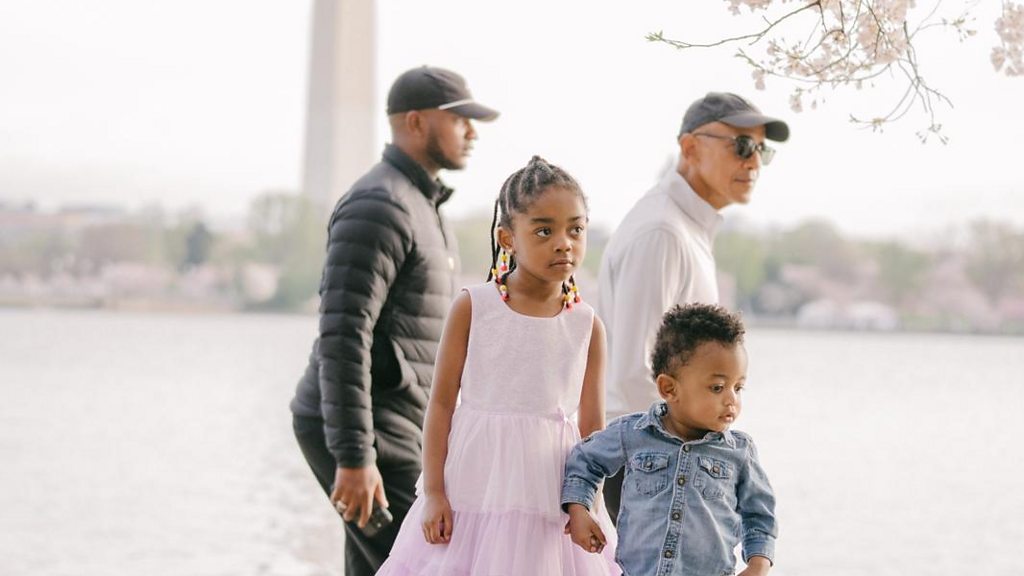 A surprise presidential photobomb makes one family's photoshoot go viral. As former US President Barack Obama set off on a morning stroll among the cherry blossom trees in Washington DC, he happened to walk by Portia Moore along with her husband Damien and their two children Preston and Belle. Portia didn't notice Obama at the time, revealing it was her husband who pointed the former president out after they were finished. The couple alongside their photographer Briana Inell share what's happened since their viral photo moment. Photo credit: Briana Inell. Photo shows Preston and Belle with President Obama in the background.