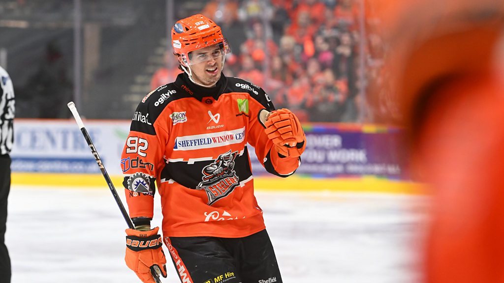 Sheffield Steelers winger Mitchell Balmas speaking to Peter Spencer, after their 3-2 penalty shot win over Cardiff.