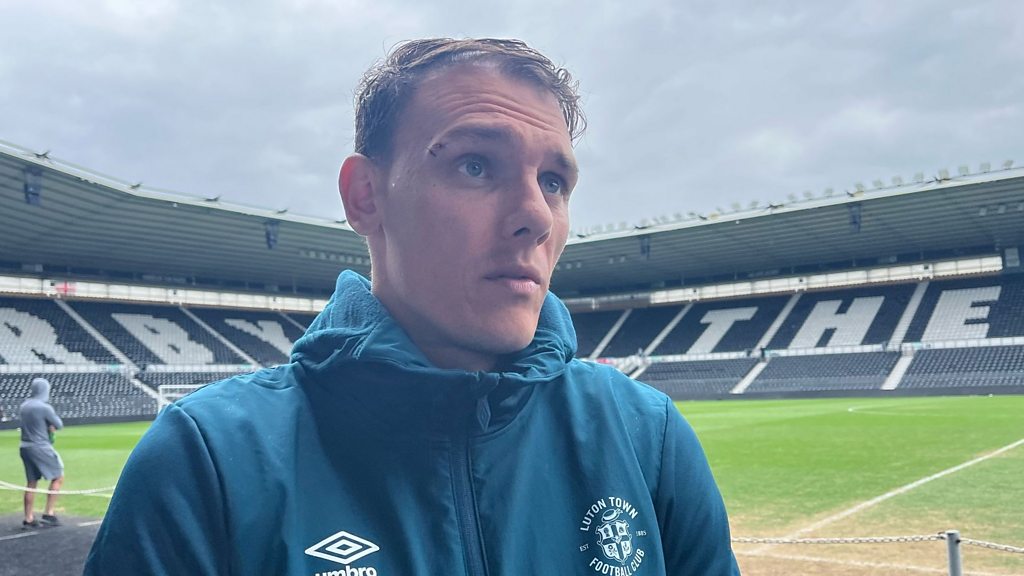 Luton Town defender Kal Naismith reacts after beating Derby County 1-0.