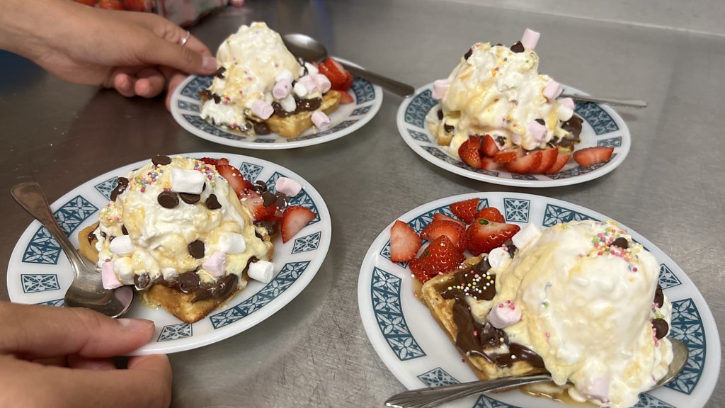 Making the best 'everything' waffle desserts at an after school tea time club for young people