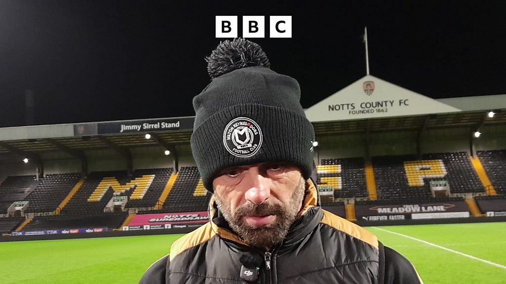 Paul Warne reacts after MK Dons concede late to make it 3-2 against Notts County. Image: BBC
