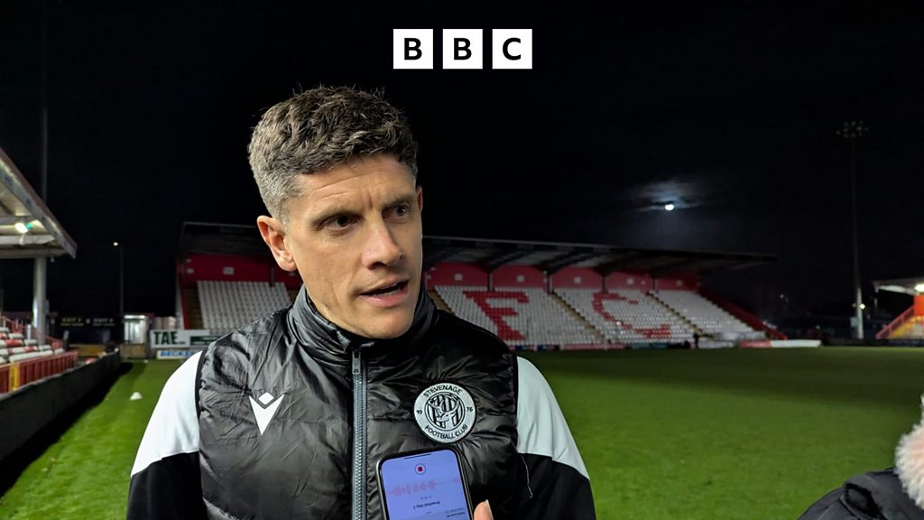 Manager Alex Revell reacts after Stevenage's 1-0 loss at home to Cardiff City. Image: BBC