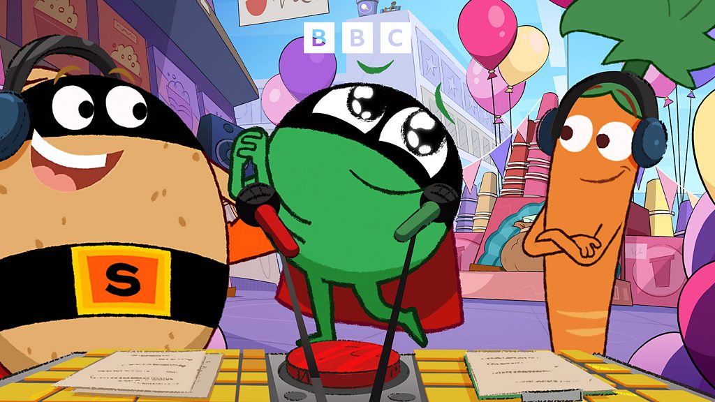 DJ Carrot introduces a new feature on the Tato Radio Show where fruit and veggies have recorded messages remembering their favourite Supertato Moments – stories from when Supertato has helped them out. But Evil Pea plots to change the endings of the stories to make Supertato sound like a baddie!