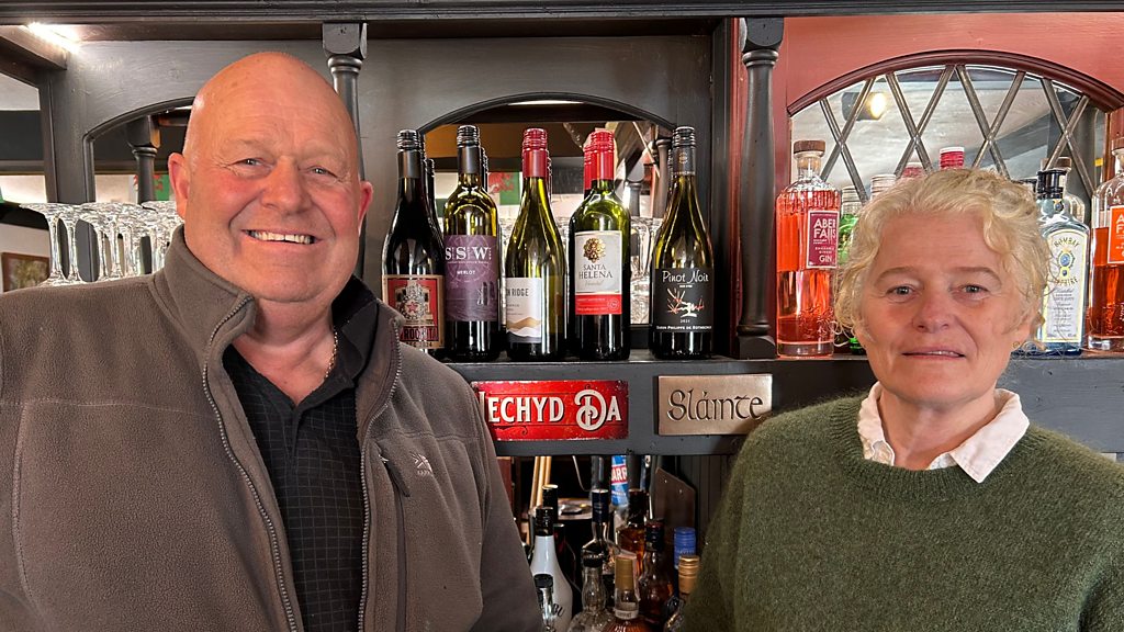 Alun Jones ac Ann Anderson yn sgwrsio o dafarn Gwesty'r Tŷ Gwyn, Rowen