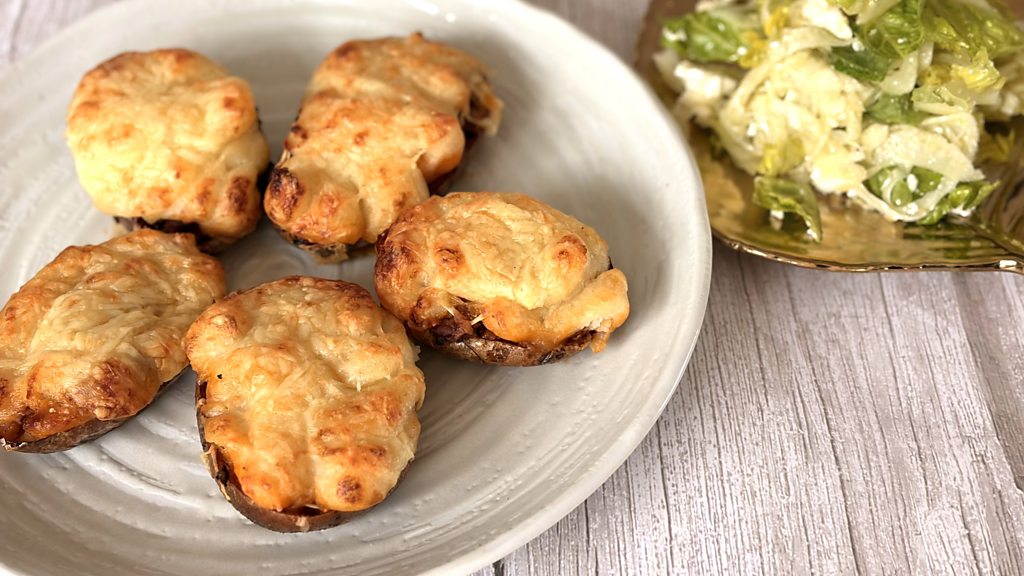 Shepherd Pie Jackets with fennel and feta salad Shepherd Pie Jackets 4 large baker potatoes, scrubbed 250g lamb mince 1 tablespoon oil 1 onion, finely chopped 2 cloves garlic 1 stick celery, finely chopped 1 small tin chopped tomatoes 1 tablespoon tomato puree 250ml beef stock 1 tablespoon Worcestershire sauce 50ml milk 125g finely grated cheddar Bake the potatoes in a 180oc oven for about 45 minutes or until cooked through. Heat a pan until smoking hot and add the lamb mince. Cook until sealed off well. Drain off the fat and add the onion, garlic and celery to the pan and cook for about 10 minutes. Add the tomato puree, tomatoes, stock and Worcestershire sauce and simmer for 20 minutes. Check seasoning. Cut the potatoes in half while warm and scoop out the flesh. Mash the flesh with the milk and season to taste. Place the shells in a baking tray and spoon the mince. Spoon or pipe the potato on top and then sprinkle with the cheese. Bake in a 180oc oven for about 20 minutes or until golden and bubbling. Fennel and feta salad 1 tablespoon white balsamic vinegar ½ teaspoon Dijon mustard 75ml olive oil 1 teaspoon honey Salt and pepper to taste 1 bulb fennel 1 little gem lettuce 75g crumbled feta Whisk the vinegar, mustard and oil together with the honey and season to taste. Cut the fennel in half and remove the core. Slice as thinly as you can and toss into the dressing. Toss in the feta. Shred the lettuce and mix in.