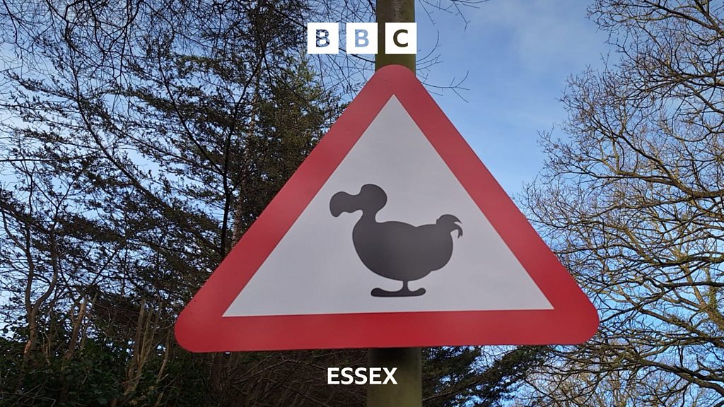 Feathers have been ruffled again in an Essex village after a controversial sign was attached to a lamp post, warning motorists that ducks may be crossing the road, despite residents saying they had never seen a duck in the area. The red triangular sign cost £7,000 and can be seen on Daws Heath Road near Hadleigh. There's now been further bemusement after another warning sign appeared on the same road featuring the extinct dodo... Picture credit: Mark Hardie/BBC.