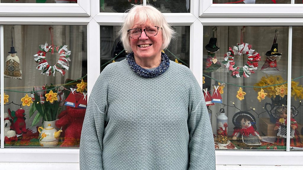 Ann P Williams yn sgwrsio am addurno ei ffenestr liwgar yng nghanol y pentref