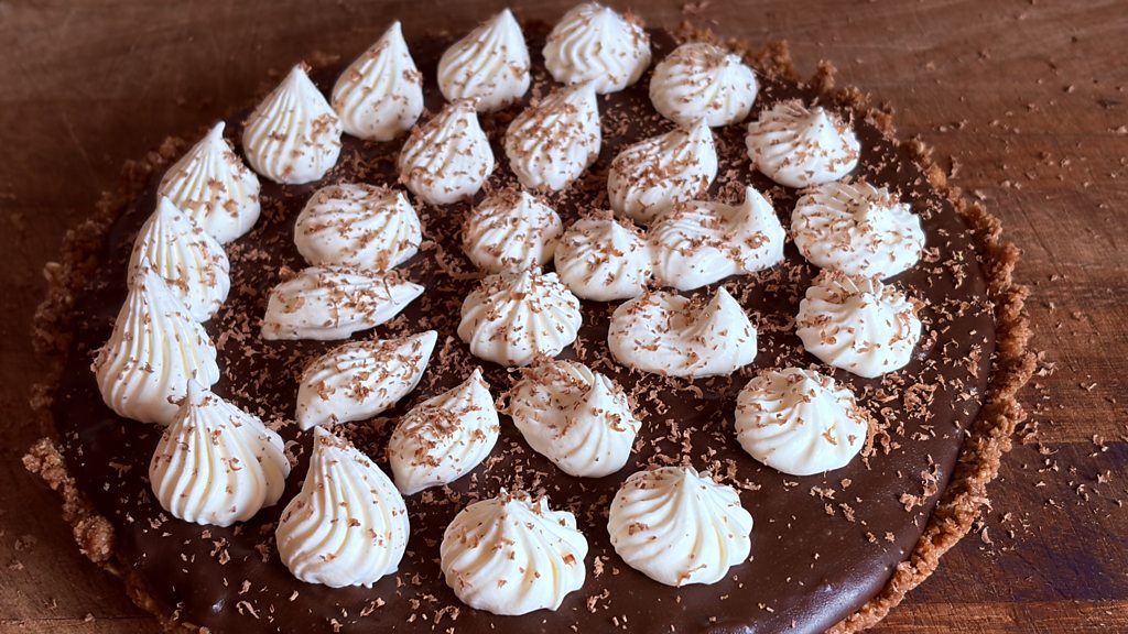Recipe Biscuit base 200g chocolate oaty biscuits, crushed 65g melted butter Mix together and press into a pie tin up the sides a bit and chill. 100g chopped dates 50ml PX sherry Mix, cover and leave overnight. 150g chopped dark chocolate 150g chopped milk chocolate 150ml double cream 25ml banoffee toffee 25g butter Place the chocolates in a heat proof bowl. Heat the cream, butter and toffee in a pan until bubbling, pour over the chocolate and stir until melted. Add the dates and mix well. Pour into the biscuit base and smooth off. Chill for a few hours to set but take out of fridge at least an hour before serving. 250ml double cream whipped 25g dark chocolate Pipe the cream over the top and finely grate the chocolate all over.