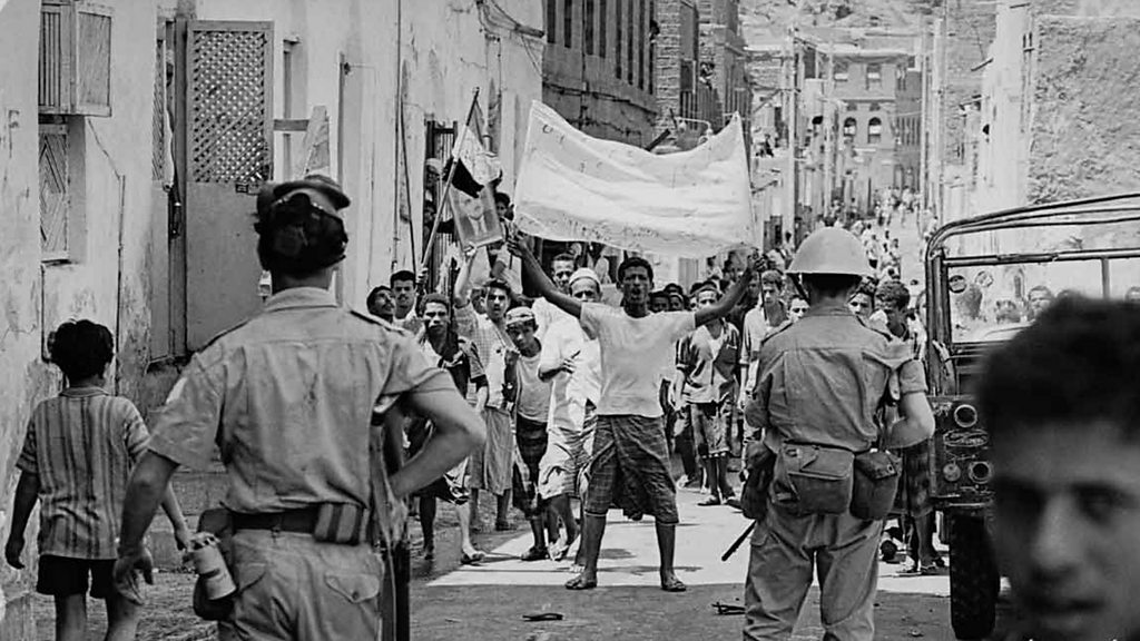 In 1967 the British withdrawal from their colony of Aden led to the creation of the People's Republic of South Yemen. Britain had colonised the port city in 1839. Aden had been at the centre of the British colonial trading system and had been one of the busiest ports in the world. The handover has been described as one of the most chaotic in British colonial history. Farhana Haider has been speaking to the former British diplomat, Oliver Miles and to Ghassan Luqman who says the scars of Britain's quick withdrawal are still being felt in Yemen today. Photo: Aden 1967 Copyright: Alamy.