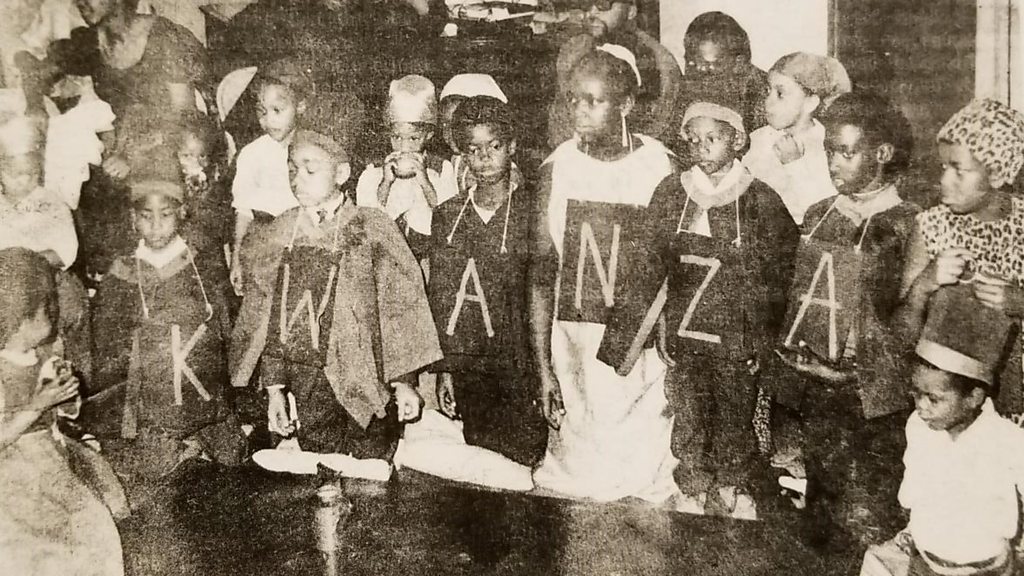 In December 1966, a group of Black activists in Los Angeles created the winter holiday Kwanzaa to try to reclaim their African heritage. It's now celebrated by millions across the US. Lucy Burns speaks to Terri Bandele, who attended the first Kwanzaa celebrations aged 11. Picture: Children at the first Kwanzaa celebration - courtesy of Terri Bandele (on right)