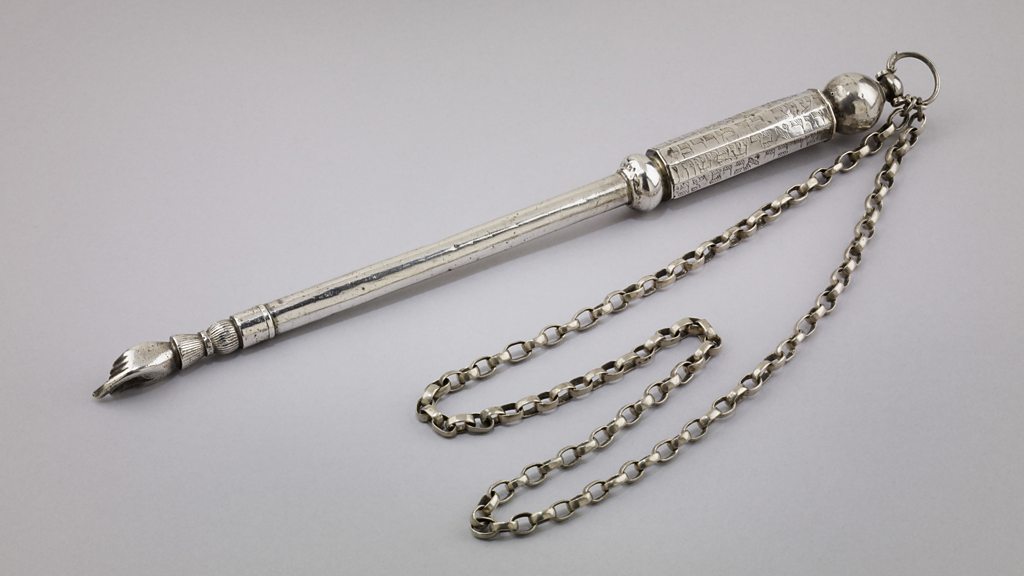A striking cobalt blue mosque lamp, from around 1570, shows an Islamic way of doing honour to the word - calligraphy. In Jewish religious ceremonies a yad - a small silver rod with a little hand and a pointing index finger - is used to follow the text during readings from the Torah, to avoid any damage to the delicate parchment. Neil MacGregor reflects on faiths which focus on the word rather than the image as an expression of beliefs. Image: A yad, Credit: British Museum