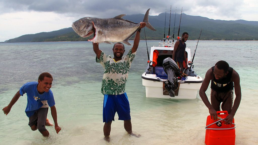 What is the fastest growing sector in tourism? It is cruise ship holidays, increasing exponentially and globally. Twenty-five million cruise vacations were taken this year and that will double very soon. International cruise lines want remote, pristine and idyllic places to satisfy the appetite of passengers to be somewhere beautiful, especially in the Pacific. In a remote, tiny community in the southern tip of Vanuatu in the South-West Pacific, a village is earning more than ever through hosting gleaming white giant cruise ships that regularly appear over the horizon. Most months more than 25,000 visitors step ashore. The attraction is Inyeug, marketed to tourists as Mystery Island - a tiny offshore reef-ringed island, fringed by a beautiful beach and surrounded by sparkling clear turquoise shallow water. Susie Emmett listens to villagers as they prepare souvenirs and village tours. She asks the captain of a cruise ship about the effects of the ships on the environment. And she joins tourists as they explore and meets the teams dealing with the debris after their departure. (Photo: Locals hold up their catch from fishing in the island of Inyeug. Credit: Green Shoots)