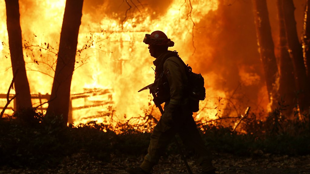 Most of the town of Paradise, California, in the Sierra Nevada foothills, has been obliterated by raging wildfires. Dozens of people are known to have lost their lives and hundreds are still missing. Ellen VandenBerg recounts how she managed to escape the blaze with her 5-month-old son and her dog in tow. Also: Professor Glen MacDonald from the University of California, Los Angeles explains the connection between climate change and wildfires; We learn about the effect that hurricane Maria had on Puerto Rico's tropical Rainforest; Fall foliage is big business in New England, with tourist visiting from around the globe, but climate change might change that; Fadi BouKaram is visiting all 47 cities and towns in the US named Lebanon, his mission: plant as many cedar trees as possible. (Sacramento Metropolitan firefighters battle the Camp Fire in Magalia, California. Credit: Karl Mondon/Getty Images)