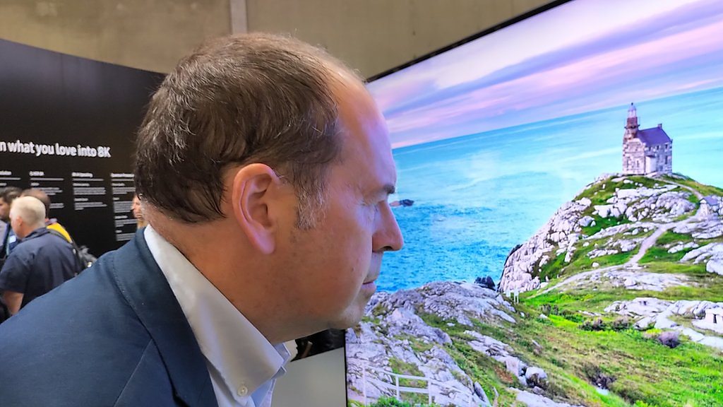 Televisions take a leap forward with 8K resolution at IFA, Europe's biggest consumer tech show. Plus Rory Cellan-Jones meets a robot designed to help you sleep, and hears why founders are convinced Berlin is the best place in Europe to set up and grow their companies. (Photo: Rory Cellan-Jones looks at a 8K resolution TV at IFA, Credit: BBC)