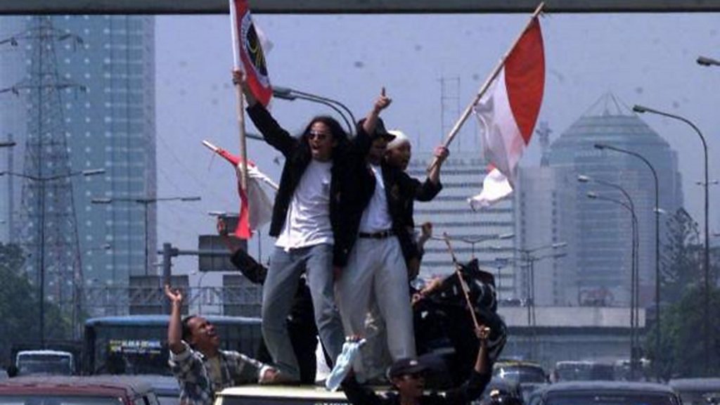 On May 21st 1998 the president of Indonesia resigned after 31 years in power. He stood down in the wake of demonstrations and riots across the country. The riots had broken out after the shooting of four student demonstrators by armed police in the capital Jakarta. In 2014 Alex Last spoke to Bhatara Ibnu Reza who took part in the demonstrations and who was with one of the students when he died. Photo: Students celebrate outside the Parliamentary buildings, Jakarta after Indonesian President Suharto announced his resignation. Credit: Adam Butler/PA