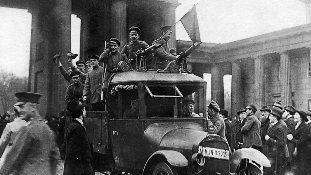 After four years of war Germany was on the verge of defeat. Its armies were exhausted and in retreat, its civilian population enduring hardship and hunger. As unrest grew at home, the German government and military struggled to maintain control. The German Kaiser was forced to abdicate. Germany became a republic. Hear first-hand accounts from the BBC archive of how the disastrous end to the First World War provoked revolution in Germany. Photo: Revolutionaries in a truck with machine guns in front of the Brandenburg Gate in Berlin, November 1918 (Photo by Culture Club/Getty Images)