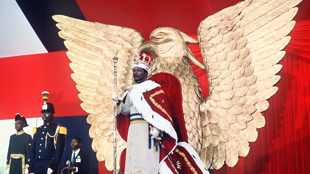 Jean-Bédel Bokassa crowned himself Emperor of the Central African Republic in a lavish ceremony on the 4th of December 1977. He'd already been President for several years since taking power in a military coup - but he wanted more. Janet Ball has spoken to one of his sons, Jean-Charles Bokassa, and to a French journalist, about the events of that day. Photo: Jean-Bédel Bokassa, stands in front of his throne after crowning himself. 04 December 1977 in Bangui. (Credit: Pierre Guillaud/AFP/Getty Images)