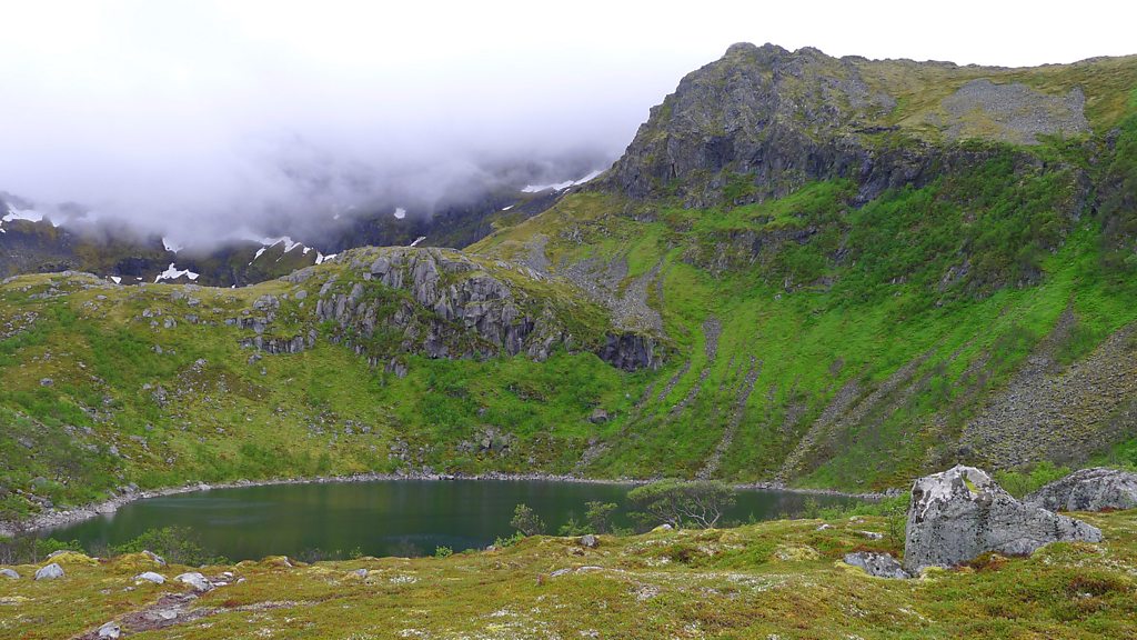 Wildlife sound recordist Chris Watson accompanies Sami Joiker, Andé Sombe, on a journey up a mountain on the Lofoten islands in Norway to explore the relationship between the sounds of the mountain, the people and the wildlife. As Chris discovers, for many Norwegians the soundscape is part of the fascination and attraction of the mountains. The mountains offer an escape from urban and man-made noise to Nature’s symphony which is composed amongst other things of the sounds of running water produced by the glacial streams, the whisper and roar of the wind, the chorus of song birds and the cry of soaring ravens high overhead. Looking around Chris is reminded that this is an Arctic landscape but in recent years the glacial ice has been melting in some of Norway’s highest mountains and we learn how a team of archaeologists have been recovering thousands of artefacts, some of which date back 6,000 years. But it is also the quality of the sounds here that intrigues Chris, and during the climb gradually he begins to understand something of the deeper more spiritual connection with the earth which is so intrinsic to the Sami culture. For Andé the mountain soundscape and his relationship to the wolves which were once so prevalent here, inspires a joik, a Sami chant, which he performs at the peak of their climb. (Photo: Mountain lake and crater Lofotens Islands, Norway. Credit: Chris Watson)