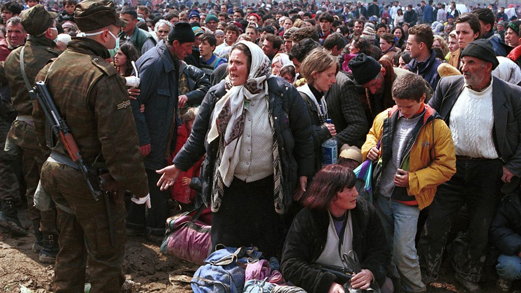 Hundreds of thousands of Kosovan Albanians were forced to leave their homes when NATO started bombing Serb targets in the former Yugoslavia in 1999. By the time the bombing stopped, on June 10th 1999, over 800,000 people had been displaced. Qerim Nuridhini is a Kosovan Albanian refugee who fled first to the Former Yugoslav Republic of Macedonia, and then to the UK. He's been speaking to Rachel Wright. A refugee from Kosovo confronting a Macedonian Policeman at Blace, Macedonia, April 5th 1999.(Photo By Sean Gallup/Getty Images)