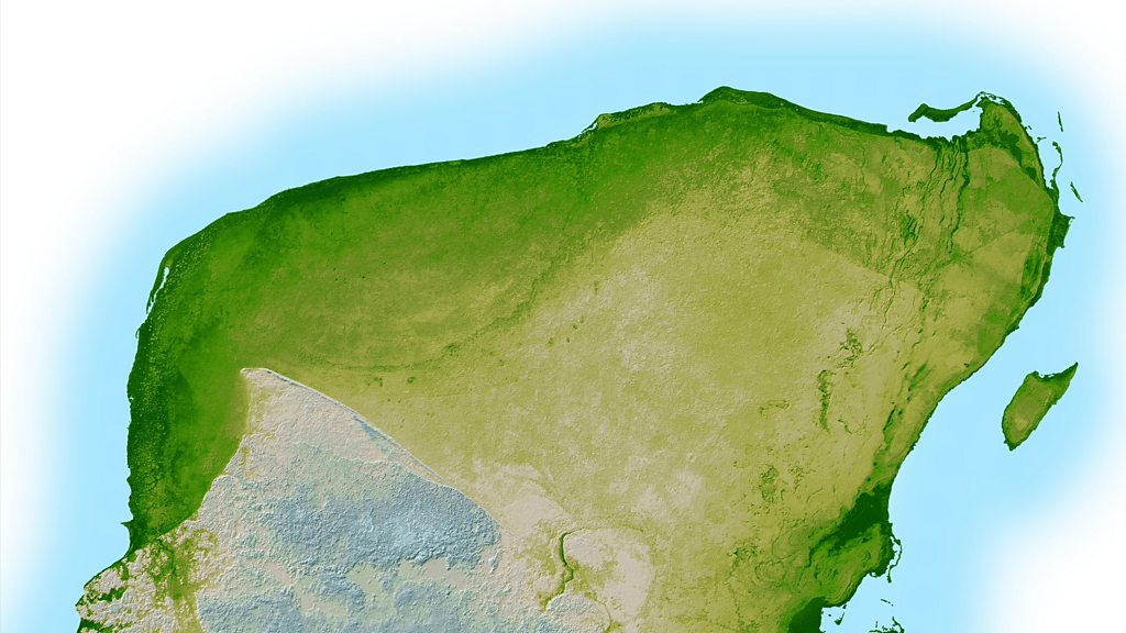 65 million years ago an asteroid hit the earth, causing the extinction of the dinosaurs along with three quarters of all species on earth at the time. The crater where it hit was discovered on the Yucatan peninsula in 1978 during a geological survey for the Mexican state oil company Pemex. It was named Chicxulub. Lucy Burns speaks to Glen Penfield, who first identified the crater, and Alan Hildebrand, whose research confirmed the discovery. Image: NASA high resolution topographical map of the Yucatan Peninsula created with data collected in the Shuttle Radar Topography Mission and released on March 7, 2003 in Washington, D.C. In the upper left portion of the peninsula, a faint arc of dark green is visible indicating the remnants of the Chicxulub impact crater. (Photo by NASA/Getty Images)