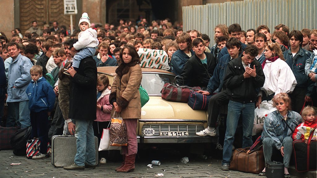 Thousands of East Germans fled to the West in the summer and autumn of 1989, before the fall of the Berlin Wall. Many of them sought refuge in the West German embassy in Prague, where they camped in the grounds and slept in stairwells and corridors, fed by the Red Cross. On September 30th, West German foreign minister Hans-Dietrich Genscher announced that they were free to travel to West Germany. Hubert and Susanne Kuhn lived in the embassy with their three children for three months. They spoke to Lucy Burns about their experiences. Photo: a crowd of East-German refugees in Prague wait to be transferred to West Germany after East Germany lifted restrictions on emigration (PASCAL GEORGE/AFP via Getty Images)