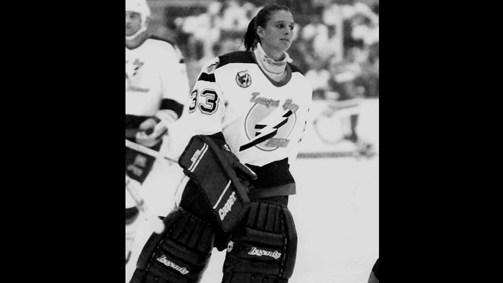 French Canadian Manon Rhéaume became the first, and only, woman to play in the National Hockey League. In 1992 she was signed by the Tampa Bay Lightning as a goaltender after a successful performance in training camp. Manon tells Rebecca Kesby how she started playing ice hockey at the age of 5 with her brothers, and why she loves playing in goal with pucks flying at her at well over 100km an hour. Manon Rhéaume played in the men professional league for 5 years and represented Canada in the Women's game. (Photo: Manon Rhéaume for the Tampa Bay Lightning in 1992. Credit: Manon Rhéaume's private collection)