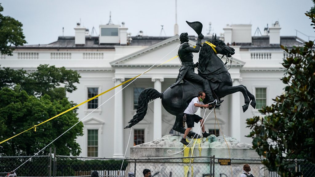 The killing of African American George Floyd ignited anti-racist protests around the world - many centred on statues associated with colonialism and slavery. Why do these figures of bronze and stone generate such strong feelings? And what do they tell us about how countries deal with their past? Contributors: Sarah Beetham Chair of Liberal Arts at the Pennsylvania Academy in the Fine Arts. Ghaith Abdul-Ahad journalist for The Guardian newspaper. AGK Menon, architect, urban planner and founder of the Indian National Trust for Art and Cultural Heritage. Daniel Libeskind, architect. Presenter: Kavita Puri (Protesters attempt to pull down the statue of Andrew Jackson near the White House June 22, 2020 in Washington, DC. Credit: Drew Angerer/Getty Images)