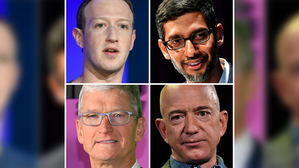 US lawmakers are deciding whether to act against the country’s powerful tech giants. Some believe the likes of Facebook, Amazon, Google and Apple are stifling competition. The companies have made huge profits during the Covid crisis and critics believe they will use this cash to buy competitors. With Charmaine Cozier. Clockwise from top left: Facebook CEO Mark Zuckerberg, Google CEO Sundar Pichai, Amazon CEO Jeff Bezos, Apple CEO Tim Cook. Getty Images