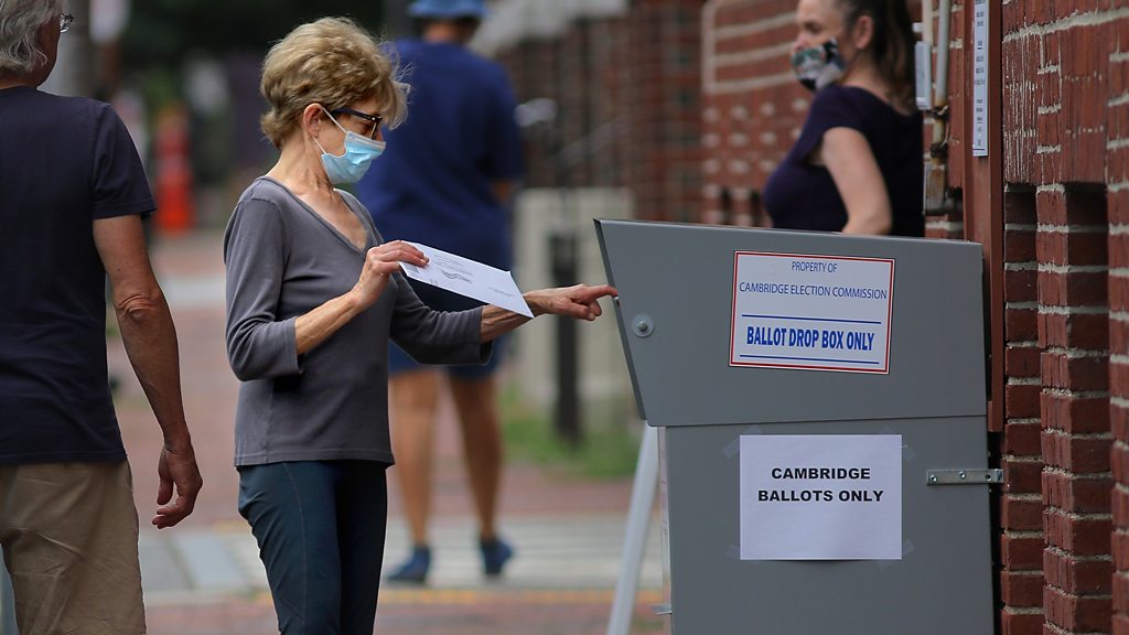President Trump says opening up November’s election to more postal voting will make it more vulnerable to fraud and election interference. Many more Americans are expected to avoid going in person to polling stations because of the coronavirus pandemic and will rely on postal voting to ensure their voices are heard. Tanya Beckett examines President Trump’s claims and how the US postal service will cope with millions of ballots. Producer: Sharon Hemans and Diane Richardson (A voter drops off a mail-in ballot at a collection box outside Cambridge City Hall, Mass. USA. Credit: Lane Turner / Getty Images)