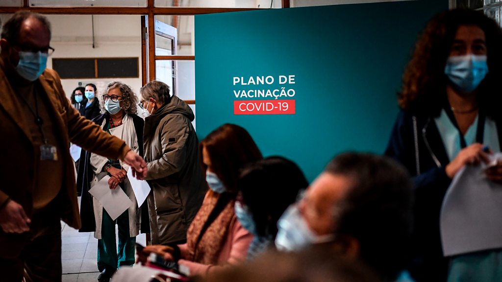 On June the 12th of last year the 27 health ministers of the European union signed off on a plan to buy vaccines on behalf of all the EU’s member countries. The aim was to secure enough doses to immunise all of its 450 million citizens. But the delivery and vaccination programme has lagged far behind countries like the UK and US. Tanya Beckett finds out why. (Waiting to be vaccinated at Santa Maria Hospital in Lisbon, Portugal. Photo: Patricia de Melo Moreiro /Getty Images)