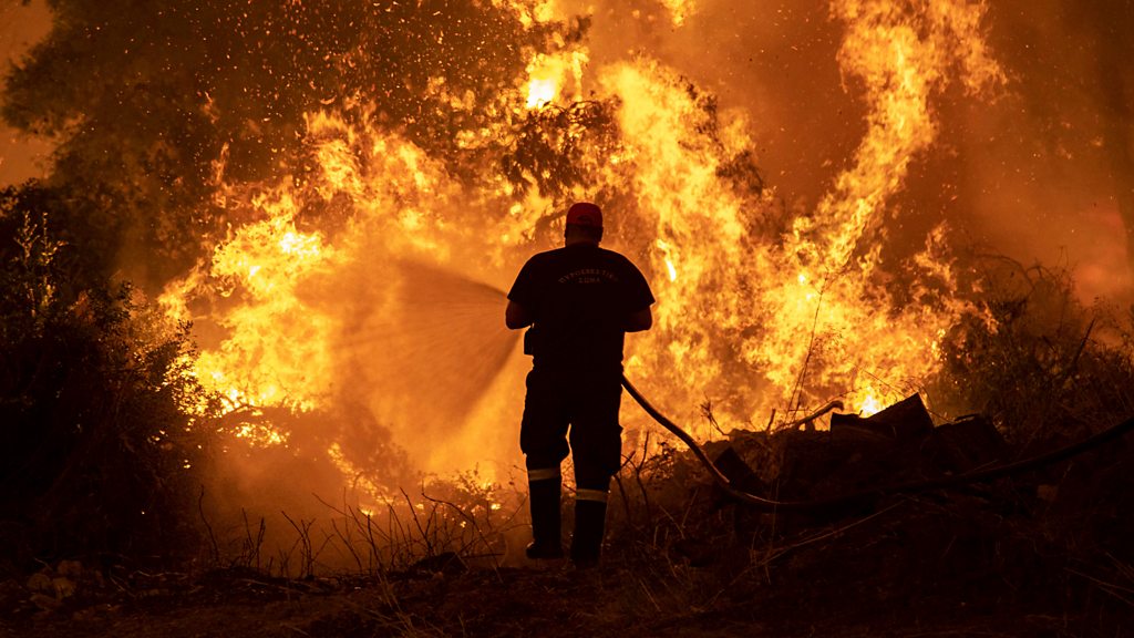 With the UN climate conference in Glasgow drawing to a close, Assignment brings us the final programme in a series telling the stories of three places devastated by extreme weather events. Maria Margaronis travels to the Greek island of Evia, where vast areas of centuries-old forests, olive groves and houses were burned by a week-long inferno. And now come the rains, bringing polluted water and mudslides. Presented by Maria Margaronis and produced by Mark Burman. (Image: A firefighter tries to extinguish a wildfire on the island of Evia, August 2021. Credit: Reuters/Nikolas Economou)