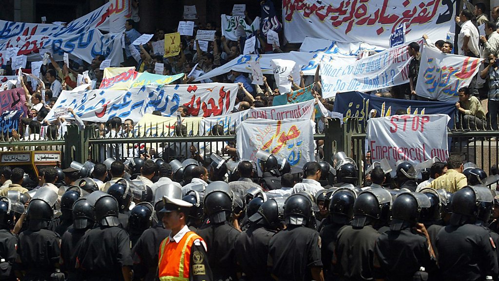 Under the slogan 'kefaya' which means 'enough' in Arabic, in 2004 Egyptians began protesting in Cairo against the rule of President Hosni Mubarak. The months of demonstrations took place several years before the Arab Spring swept through the region and they drew many people onto the streets for the first time in their lives. Paul Moss hears from Ahmed Ezzat one of a generation of young Egyptians radicalised by the Kefaya movement. Photo: Standoff between Egyptian riot police and demonstrators demanding an end to the rule of President Hosni Mubarak. May 2005. Credit: AFP via Getty Images.