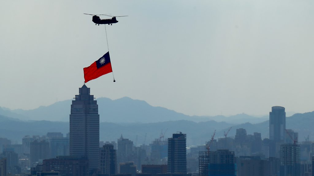 In recent weeks, China has sent a record number of military jets into Taiwan’s air defence zone. The Taiwanese Defence Minister, Chiu Kuo-cheng, has said that tensions between China and the self-governing island are the worst in 40 years. Ros Atkins examines what’s behind China’s military pressure on Taiwan. (PHOTO: Military helicopters carrying a big Taiwanese flag conduct a flyby rehearsal ahead of National Day celebration on 7 October 2021. Credit: Ceng Shou Yi/Getty Images)