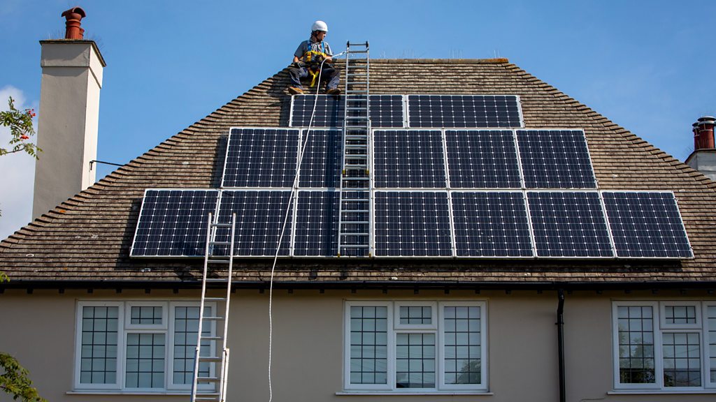Home solar – putting panels on your roof or side of your house, used be something fairly unusual. However, rising energy costs means that people are increasingly looking for alternatives. Presenter Rick Kelsey explores why the trend for solar panels is happening across Europe – and asks whether the industry has the infrastructure to cope with increasing demand. Rick travels to south east England where panels are being put on the roof, and speaks to installer Scott Burrows. And he meets Linda who rents her home – her landlord has just had solar panels fitted. Linda says she has noticed the reduction in her bills, however her central heating is gas so there might not be as big a reduction over the winter. Just over 3,000 solar installations are being carried out every week according to the trade association Solar Energy UK. That’s up from 1,000 a week in July 2020. Michael Schmela and Naomi Chevillard are from Solar Power Europe. They say they are seeing an unprecedented demand in countries across Europe, especially those that rely on gas. We also hear from a solar project in the Morogoro region of Tanzania, where farmers are using solar to run a farm and a training centre. And David Shukman, the BBCs former climate editor, talks about the affordability of solar panels and how that’s changed over recent years. How much is the demand and payback time for home solar changing? Presented and produced by Rick Kelsey. (Image: Solar panels being fitted on a roof. Credit: Getty)