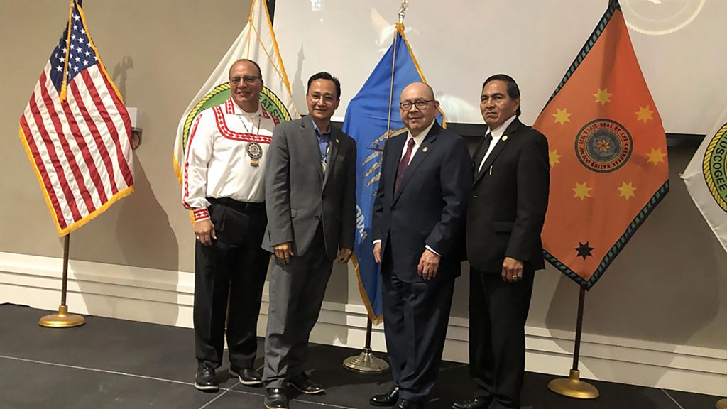 The past few years have been the most politically turbulent for the State of Oklahoma and its Native American, or Indian, population in over a century. A Supreme Court ruling, McGirt v Oklahoma, in July 2020, reaffirmed treaties that have been in place since the early 19th Century. These treaties decreed much of eastern Oklahoma as reservation land, still belonging to the Native American communities who were forcibly moved there in the 19th Century. More than 1.8 million people live on that land, including a huge chunk of the 400,000 people who live in Tulsa, Oklahoma’s second-largest city. However an inevitable legal backlash followed the McGirt decision. In June 2022 another US Supreme Court ruling named Castro-Huerta v Oklahoma narrowed the scope of the more sweeping McGirt decision. But arguments over how to interpret these judgements continue to swirl. From Native Americans refusing to pay taxes to a state that they believe no longer holds sway over them, to Indian and Oklahoma state authorities competing over who should prosecute certain criminal cases. Allison Herrera, Indigenous Affairs reporter for KOSU Radio in Oklahoma, speaks to individuals at the highest levels of State and Indian government as well as everyday citizens to explore this unique moment. (Photo: (L-R) Choctaw Nation Chief Gary Batton, Principal Chief Chuck Hoskin Jr. of the Cherokee Nation, Governor Bill Anoatubby of the Chickasaw Nation and Chief David Hill of the Muscogee Nation)