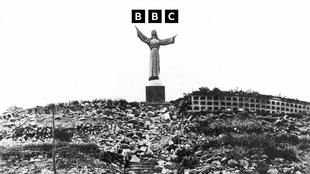 On 31 May 1970, the Huascarán avalanche, caused by the Ancash earthquake, destroyed the town of Yungay, in Peru. Only 400 people, out of a population of 18,000, survived. A clown, named Cucharita, saved approximately 300 children, who were at a circus performance, by leading them to higher ground. Rachel Naylor speaks to his son, Christian Peña. (Photo: Statue of Christ at the cemetery overlooking Yungay, after the avalanche. Credit: Science Photo Library)