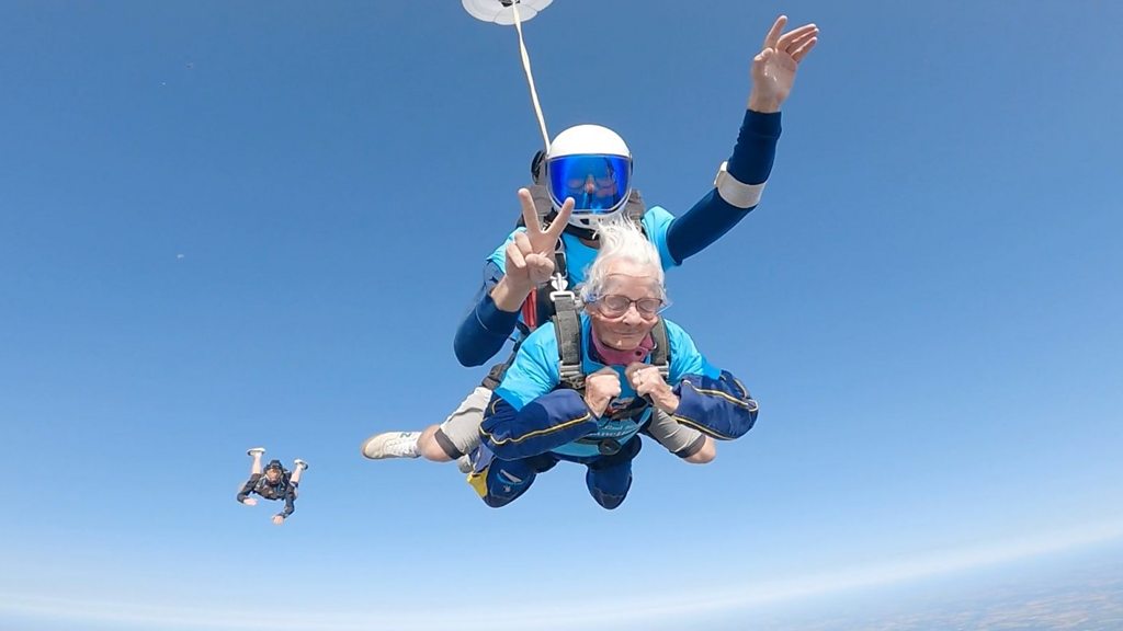 We meet Manette, the 102-year-old who has become Britain's oldest skydiver. She wanted to do the jump to raise money for three charities, but also to prove you are never too old to go out of your comfort zone. Also, as the Paralympics get underway, we hear the stories of inspiring athletes including USA swimmer, Ali Truwit, who was attacked by a shark. Presenter: Rachel Wright Music: Iona Hampson (Photo: Manette flying through the sky. Credit Goldster)