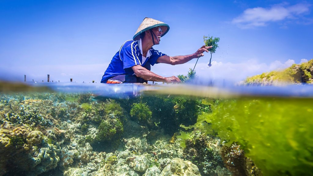 It's a familiar feature of our oceans and beaches and yet its environmental impact has largely been overlooked. Now supporters say seaweed can help us address climate change by reducing our reliance on fertilisers, and by reducing the methane emissions produced by cows. On top of that, proponents say a new material produced from the sugars in seaweed could provide a biodegradable alternative to the millions of tonnes of single-use plastic we throw away each year. No wonder the World Bank is predicting a global seaweed boom worth $12bn this decade. We hear from scientists and entrepreneurs from Australia to Zanzibar who say we are only just beginning to understand the exciting possibilities posed by this ubiquitous underwater species. The Irish folk tune Dúlamán, about the island’s traditional seaweed gatherers, is used with the permission of musician Seoirse Ó Dochartaigh. Produced and presented by Vivienne Nunis. (Picture: Seaweed farm. Sumbawa. Indonesia. Credit: Getty Images)