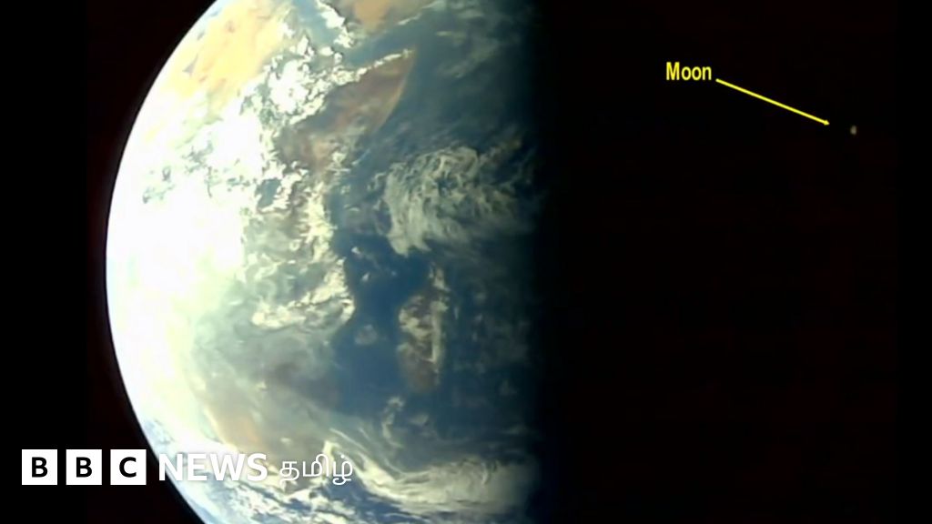 பூமியை நோக்கி எடுத்திருக்கும் புகைப்படத்தில் பூமியின் வெளிச்சமான பகுதியும் கருமையான இரவு நேரம் இருக்கும் பகுதியையும் பார்க்க முடிகிறது. கூடவே நிலா பூமிக்கு மேலே சிறு வட்டமாகத் தோன்றுகிறது.