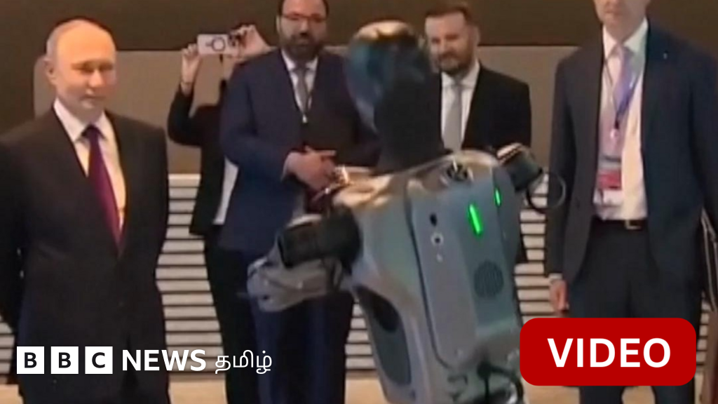 ரஷ்ய அதிபர் விளாடிமிர் புதின் முன்பு ரோபோட் ஒன்று நடனமாடும் காட்சி இது.