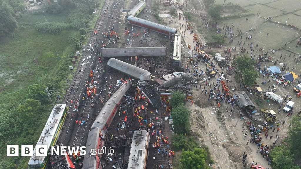 கோரமண்டல் எக்ஸ்பிரஸ் ரயிலின் இன்ஜின், சரக்கு ரயிலின்மீது ஏறியிருப்பதை ஒடிஷா விபத்தின் புகைப்படங்கள் காட்டுகின்றன. இன்ஜினுக்குப் பின்னால் இருந்த பல பெட்டிகள் ஒன்றுடன் ஒன்று மோதியதால் நசுங்கின.