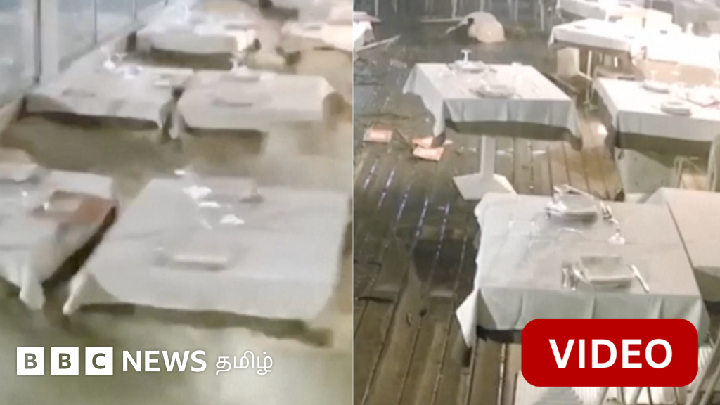 சூறாவளி காரணமாக கடும் அலை ஏற்பட்டு கடற்கரை ஓரம் உள்ள உணவகத்தினுள் கடல் நீர் புகுந்த தருணம் இது.
