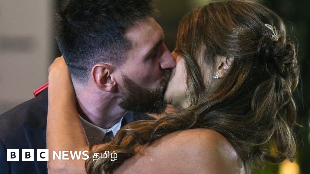 படக்குறிப்பு, நட்சத்திர கால்பந்து வீரரான லியோனல் மெஸ்ஸியும், அவரது குழந்தை பருவ தோழி ஆண்டோனெல்லா ரோக்குசோவும் திருமண பந்தத்தில் இணைந்தனர்