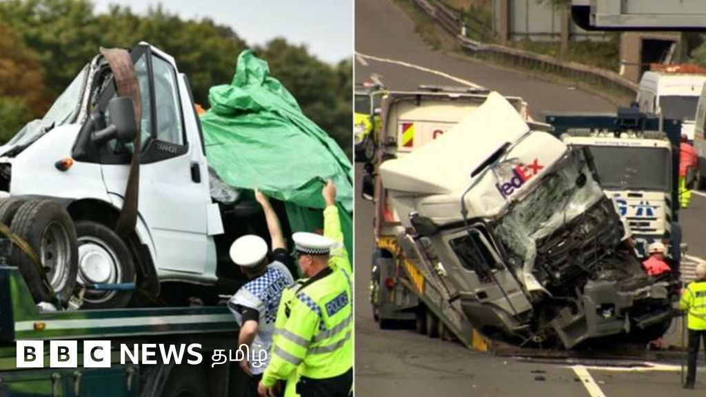 பக்கிங்காம்ஷயரில் உள்ள நியூபோர்ட் பேக்னெல் நகரில் உள்ள 15 மற்றும் 14-ஆவது சந்திப்புகளுக்கு இடையிலான நெடுஞ்சாலையில், கடந்த சனிக்கிழமை அதிகாலை 3.15 மணியளவில் மினி பஸ்ஸுடன் இரண்டு கன்டெய்னர் லாரிகள் மோதின.