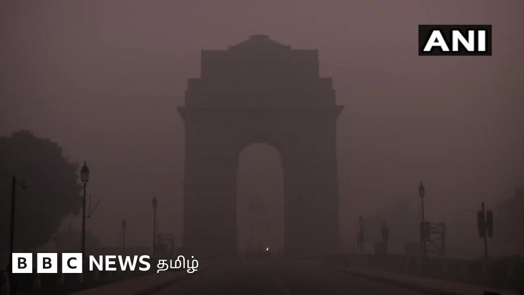 படக்குறிப்பு, பனி-தூசி மூட்டத்தில் டெல்லி இந்தியா கேட் பகுதி.